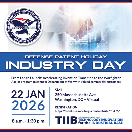 WASHINGTON, D.C – Jan. 22, 2026 – The Office of the Under Secretary of War for Research and Engineering (OUSW(R&E)) has launched a pilot program providing no-fee commercial evaluation licenses (CEL) for a curated selection of patents from War Department laboratories. This initiative maximizes the value of the Department’s $3.5 billion annual research investment by…